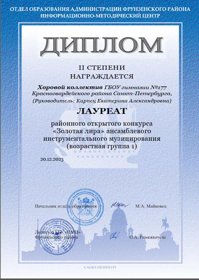 стали призерами и заняли 2 место в конкурсе «Золотая лира» ансамблевого инструментального музицирования среди учащихся общеобразовательных организаций Фрунзенского района Санкт-Петербурга;