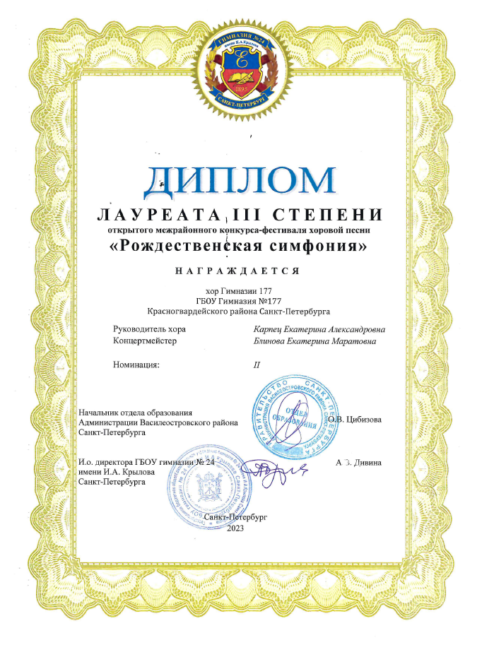 Участники студии в 2024-2025 году стали призерами и заняли 3 место в Открытом межрайонном конкурсе Санкт-Петербурга – фестивале хоровой песни «Рождественская симфония»;